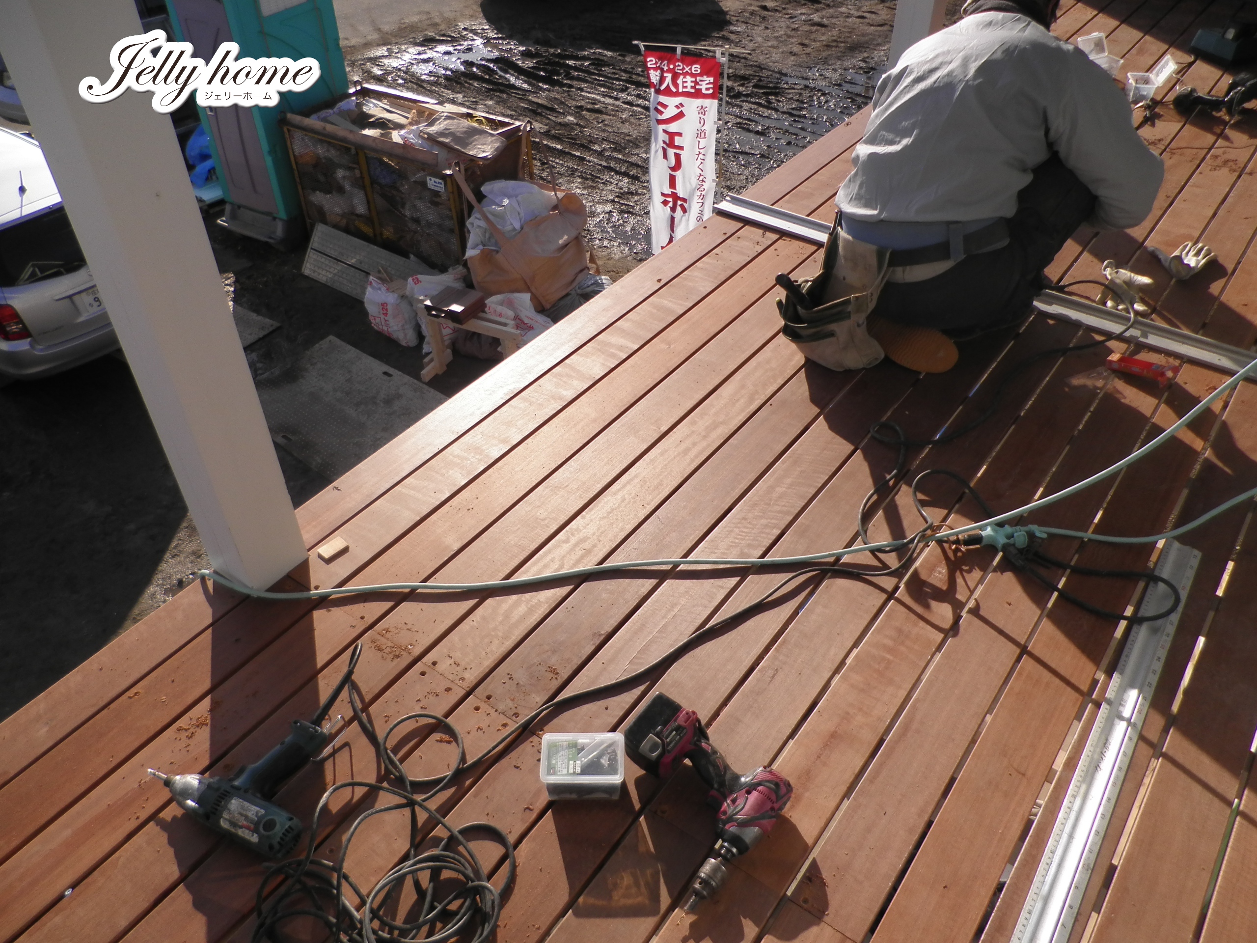 現場はいよいよウッドデッキ床材の貼り付けに入った。