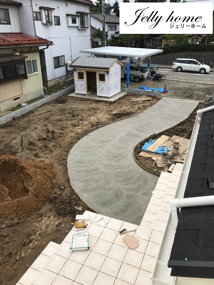 現在、アプローチは乱形石材を貼り付ける前の下地造り、
