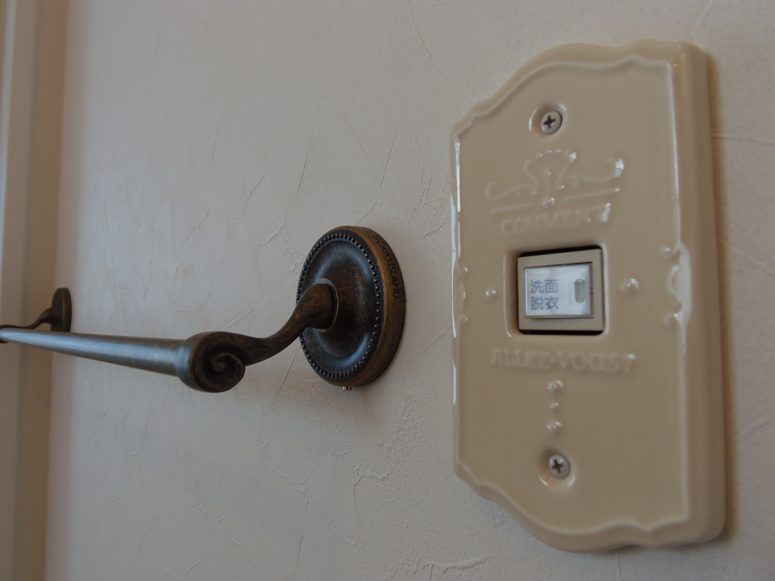 アンティーク色のタオルバーは真鍮製、お洒落なスイッチプレートはセラミック製と