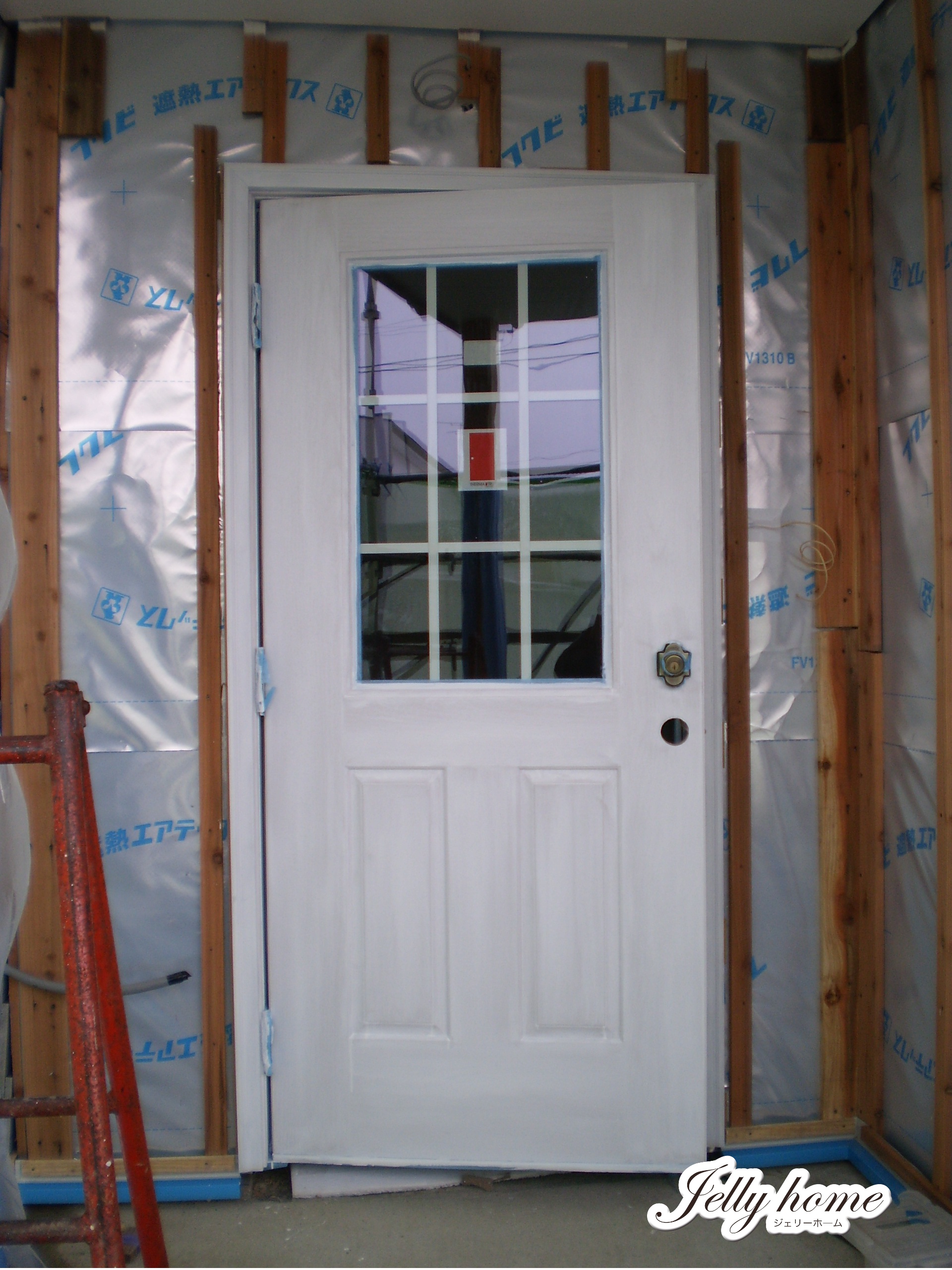 写真は下塗りが終わったばかりのドアですが、最終的には仕上げ色を塗って