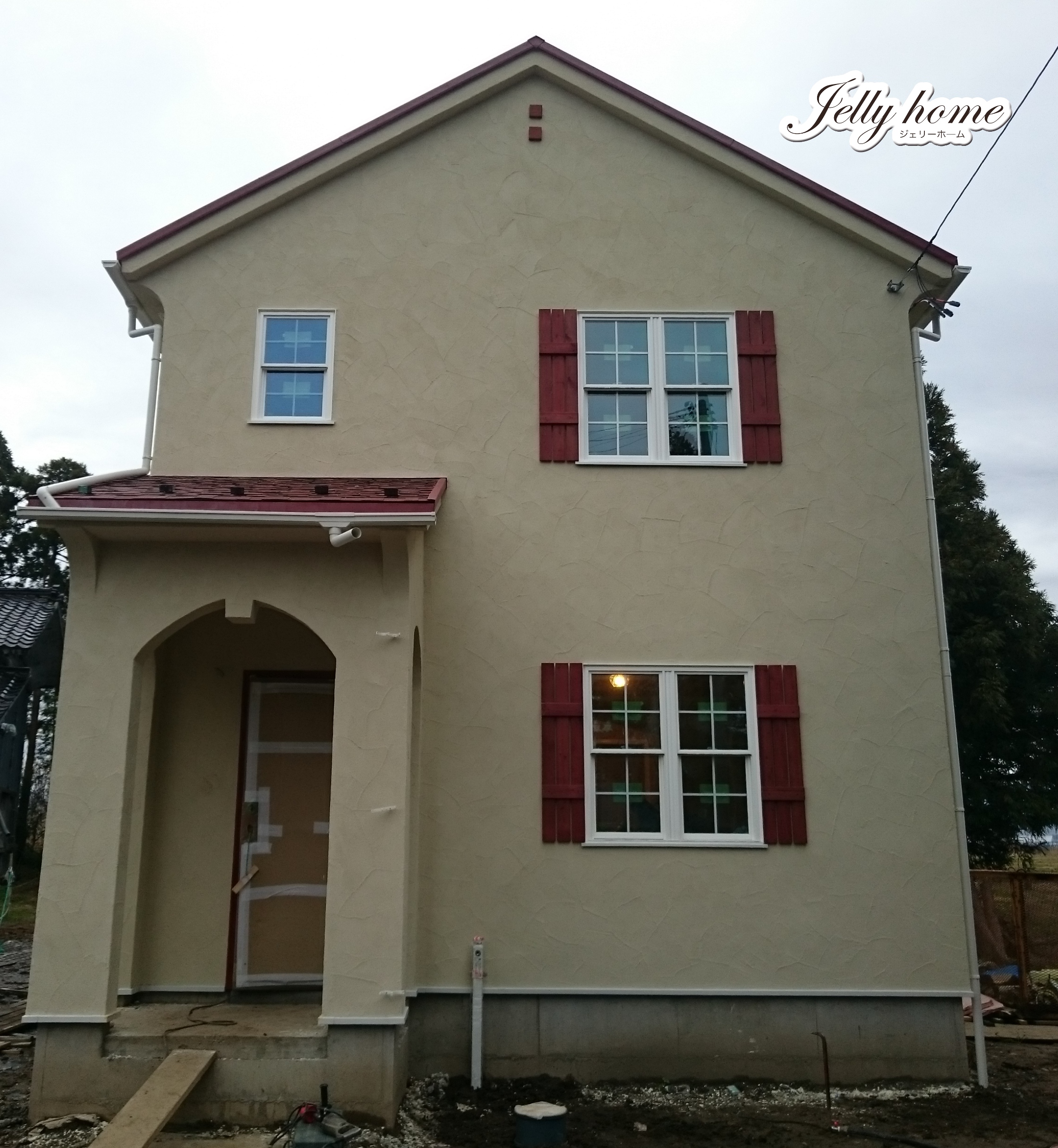 ボルドーレッドの飾り雨戸と屋根材が見事に調和していて、