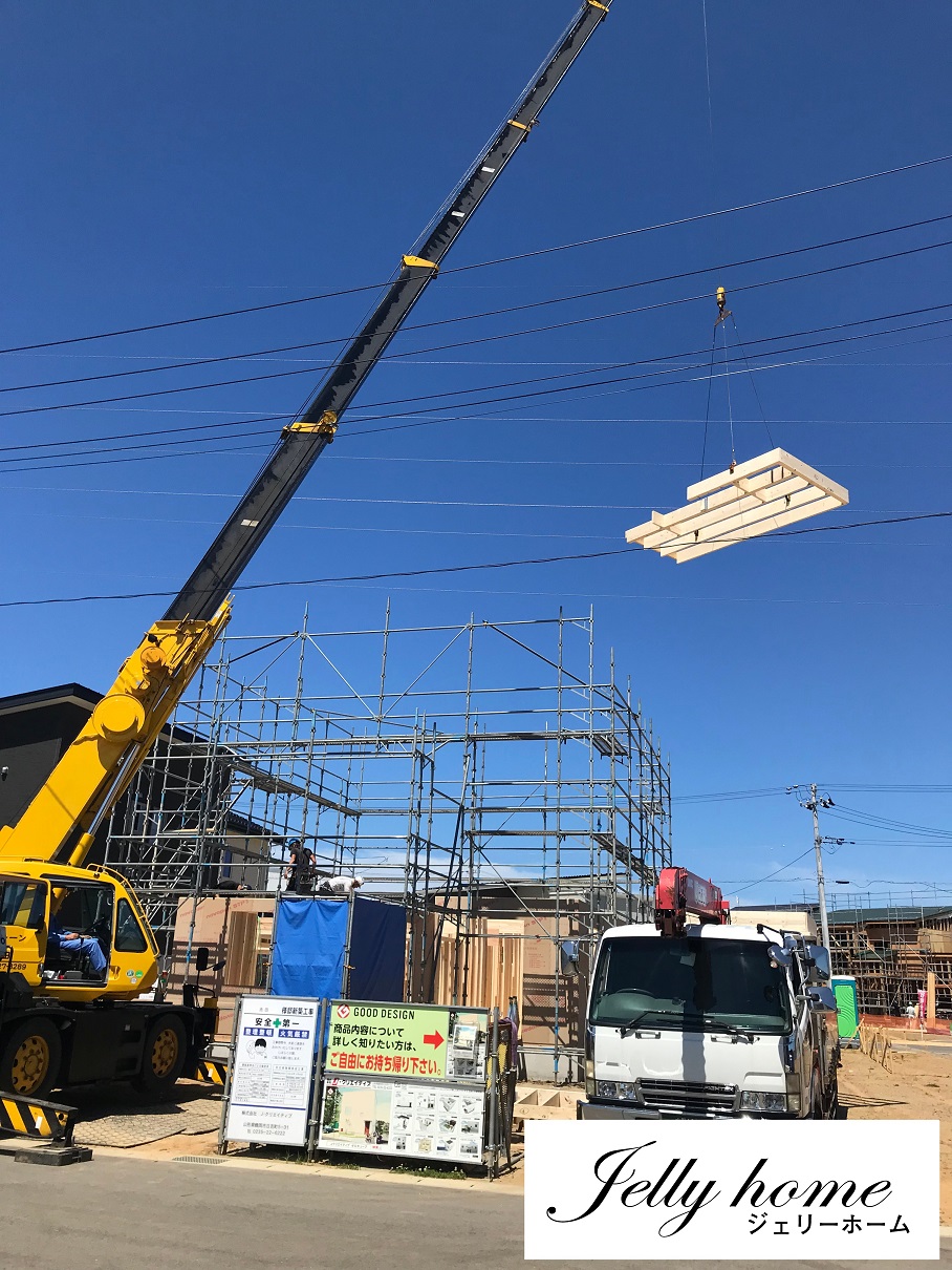 工場で作られてきたツーバイフォーパネルをクレーンで吊り上げて、