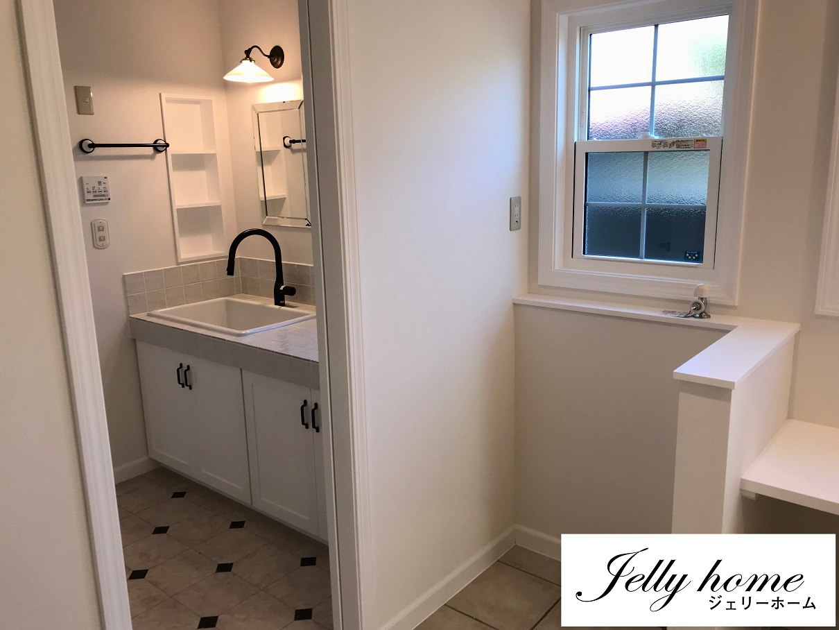 玄関ホールとキッチン両側から入れる洗面脱衣室と
