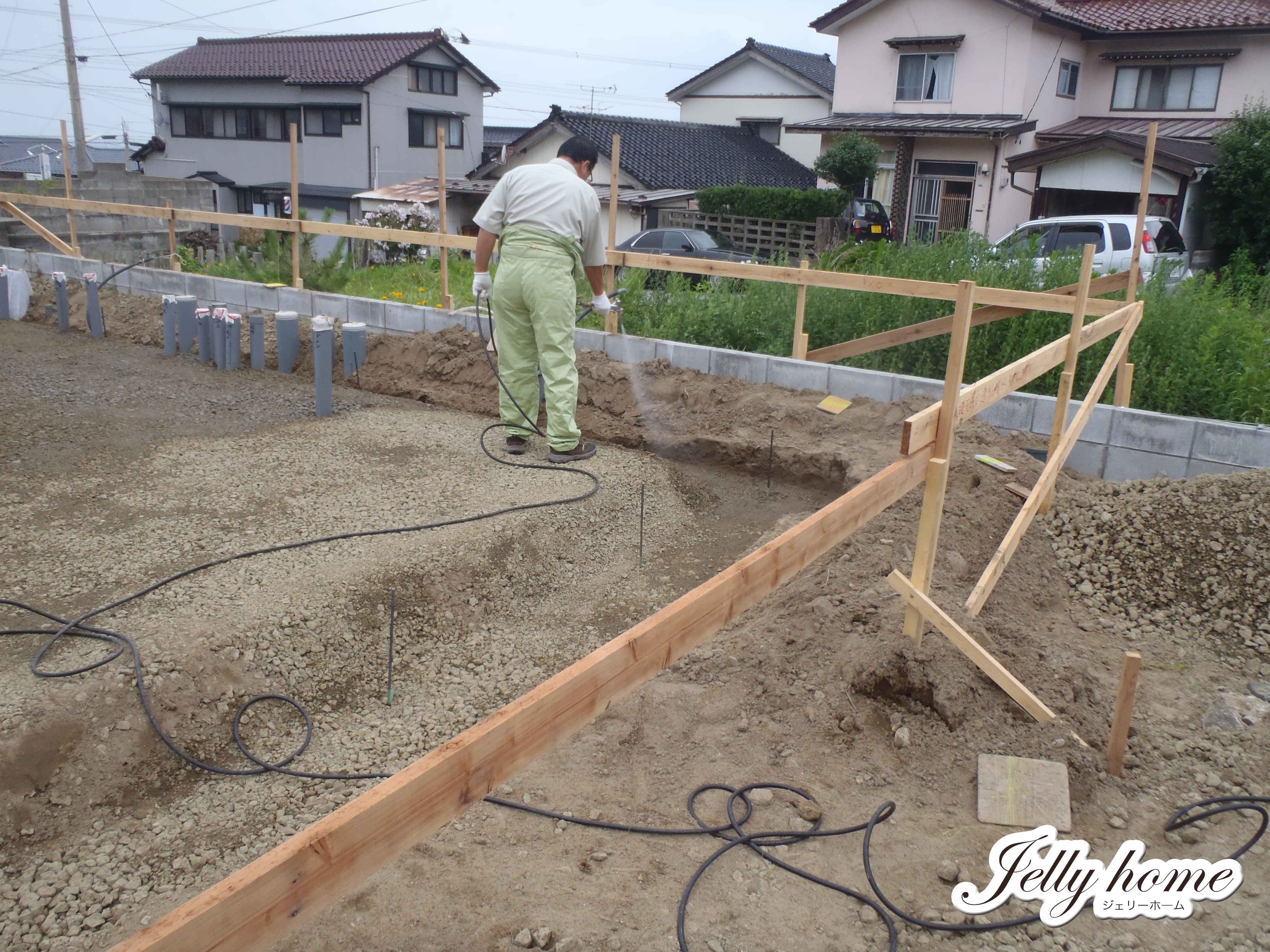 プロヴァンスの家は、基礎の砕石工事が終わるとすぐに土壌のシロアリ消毒を行った。