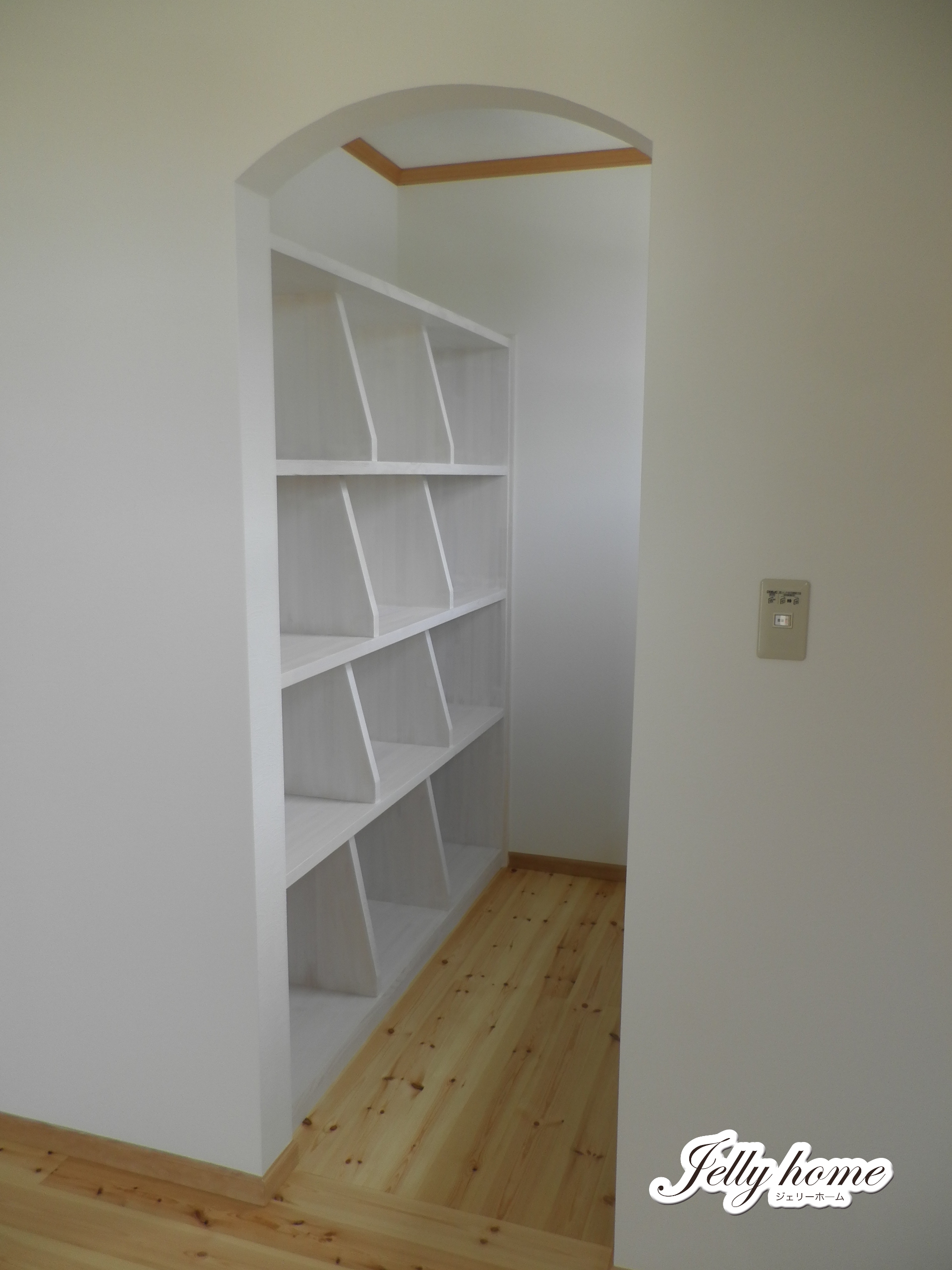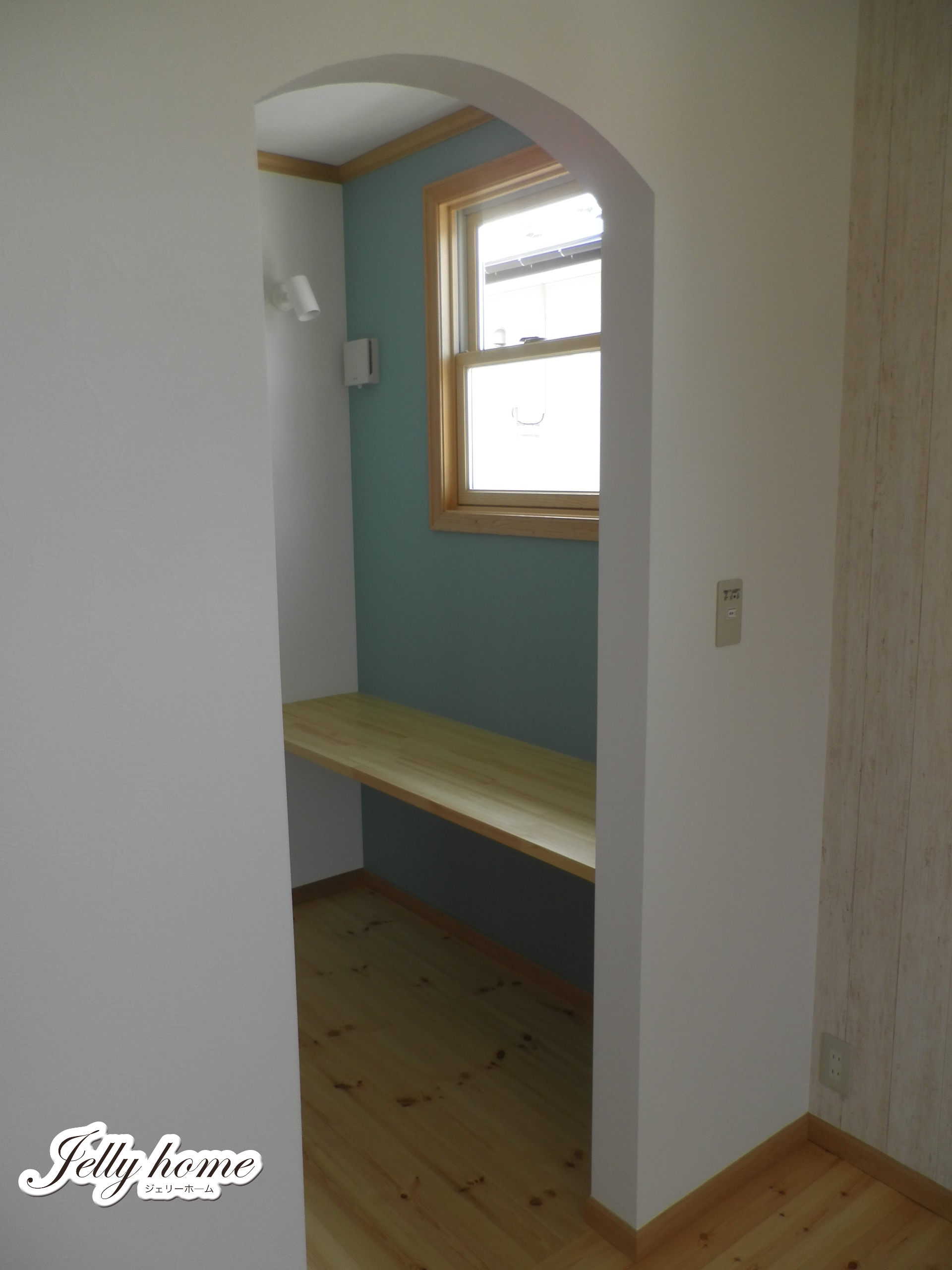 R下がり壁で隔たれた書斎のアクセントクロスは、