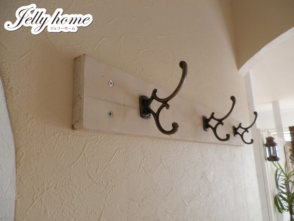 板材にラフなペイント仕上げをして、アンティークなフックを取り付けました。