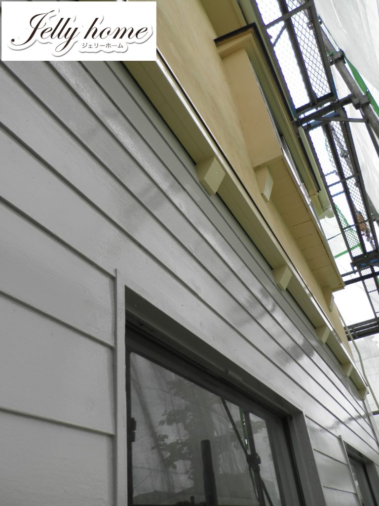 グレー色のラップサイディングとアンティーク仕上げの塗り壁のコンビネーションは、