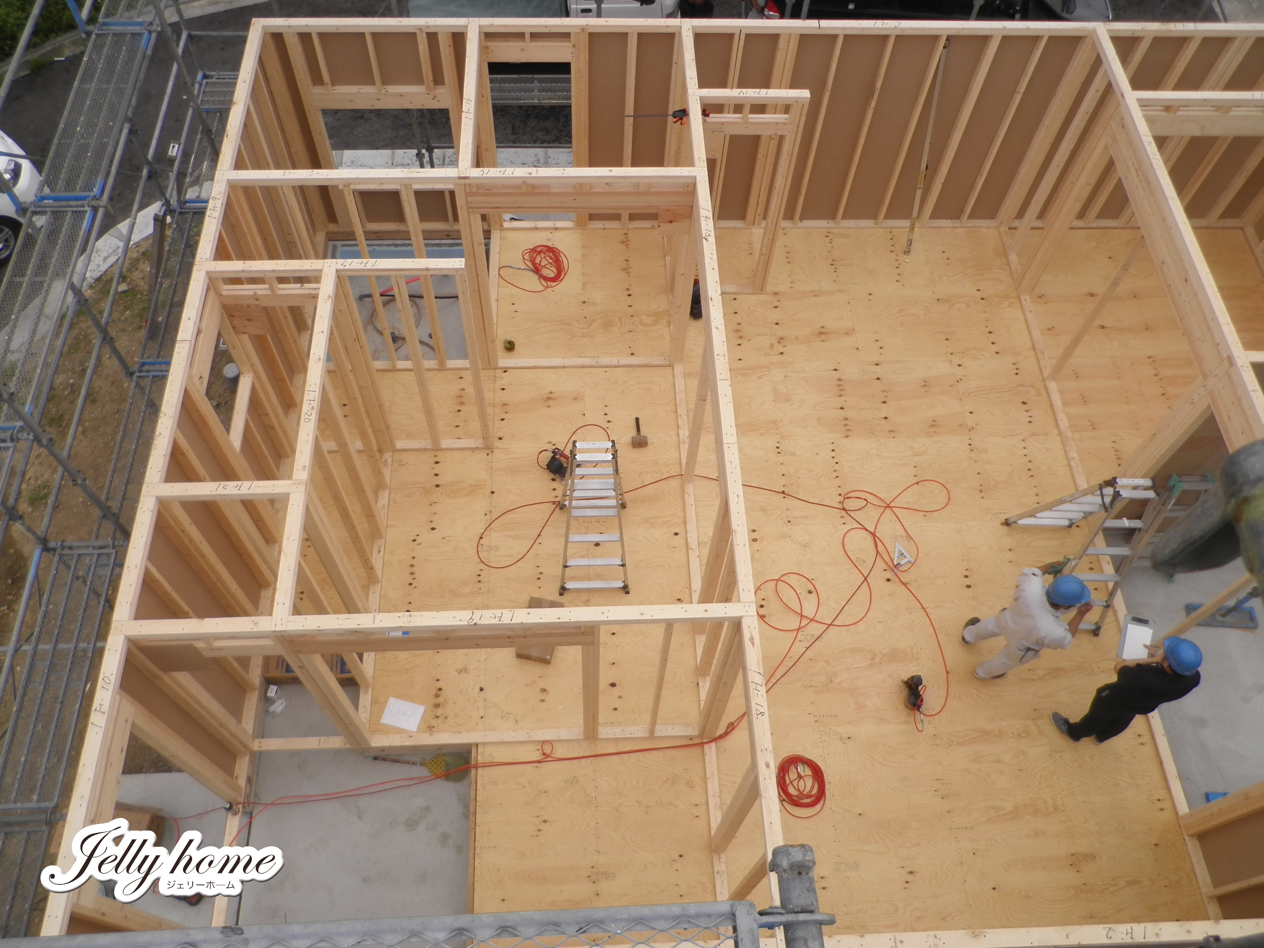 今日は1階壁組みと2階床敷きまでの工程となる。