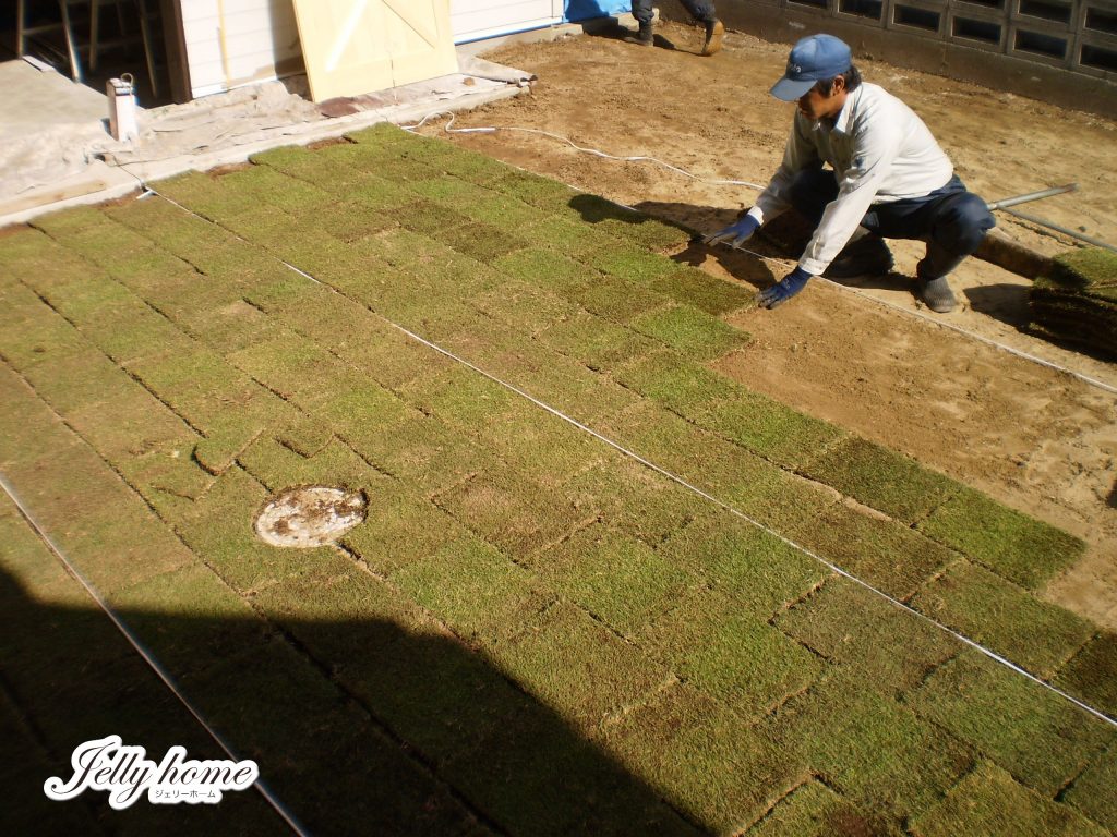 道路から死角になって見えない庭は、一面に芝生を植えて、家族の遊び場として活躍