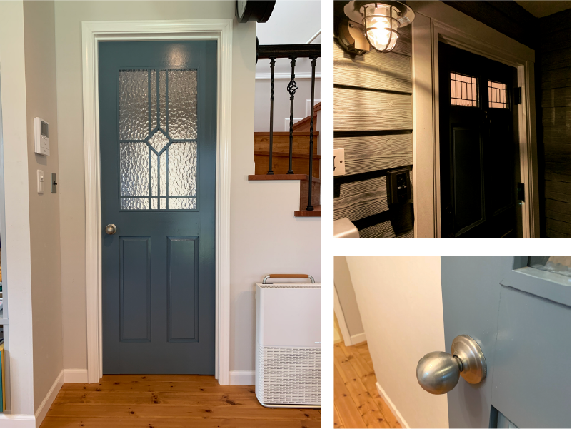 ラップサイディングの立体感や、真鍮のドアノブ、無垢床のぬくもり。