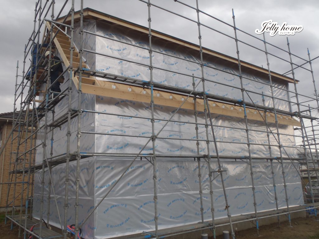 遮熱シートを貼り付けた外壁はメタリック色1色に染まった。