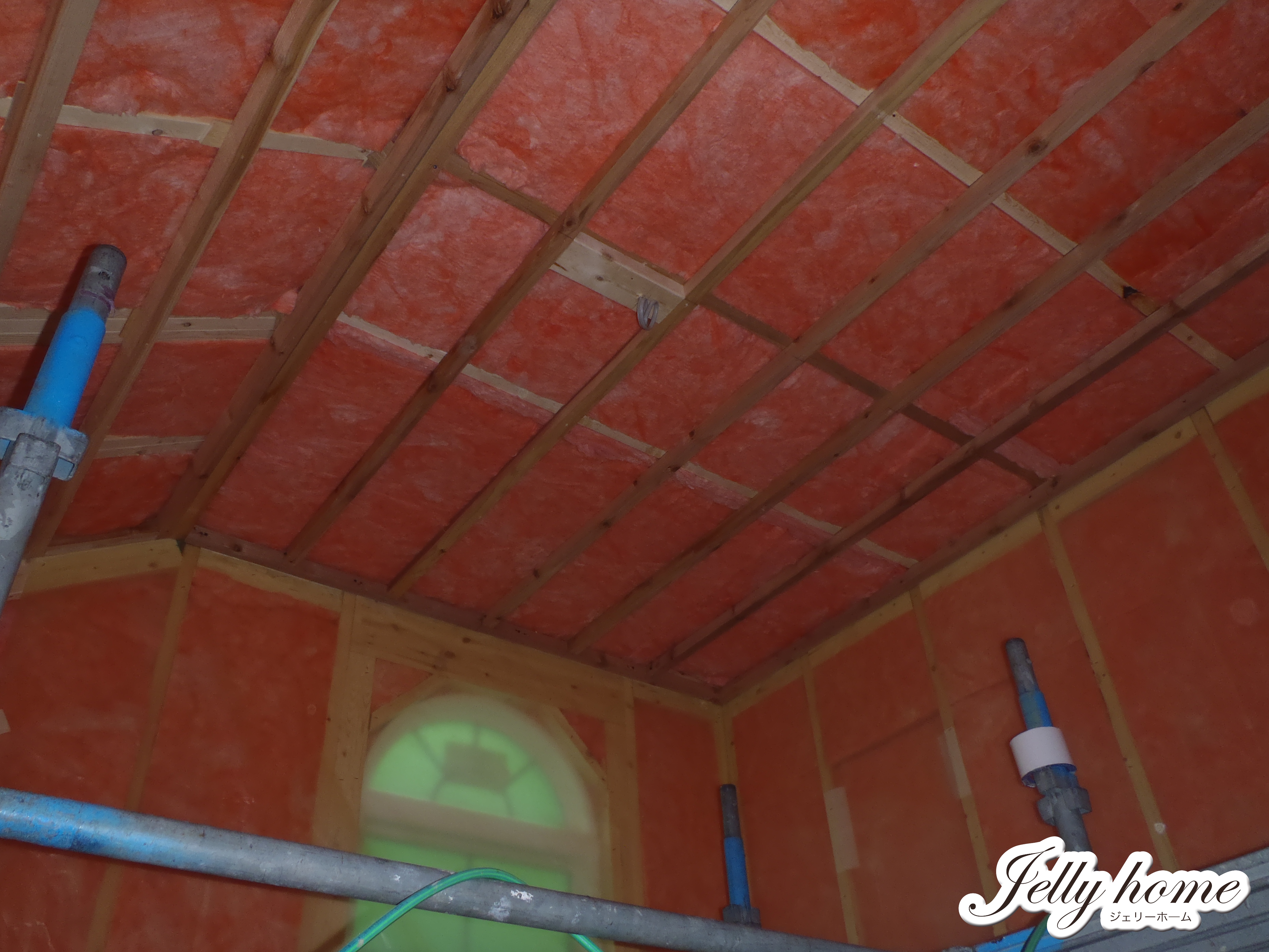 2013.07.17 断熱材、隙間なく詰めればとても綺麗です。 髙橋 純 建築の様子 Y様邸の断熱工事も終盤を迎え、室内壁がピンク色に染まってきた。 グラスウールがピンク色だからです。 まるで鯨の腹の中のように見えるが、ここはリビング上の吹き抜け部分。 実に豪快です。 にほんブログ村 応援クリックお願いします(^^