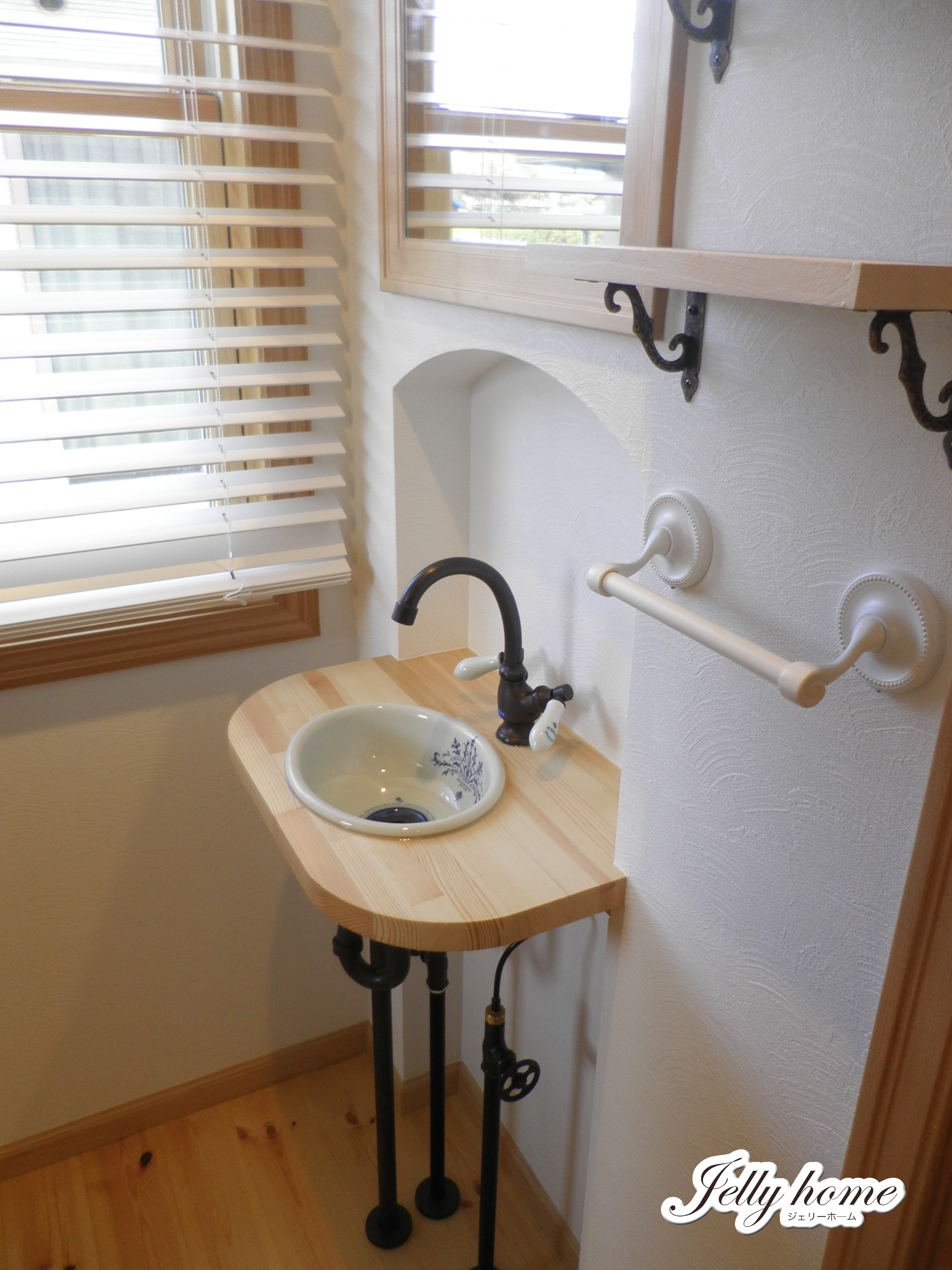 上の写真は、トイレ前に付けた手洗い器と木製ブラインド。