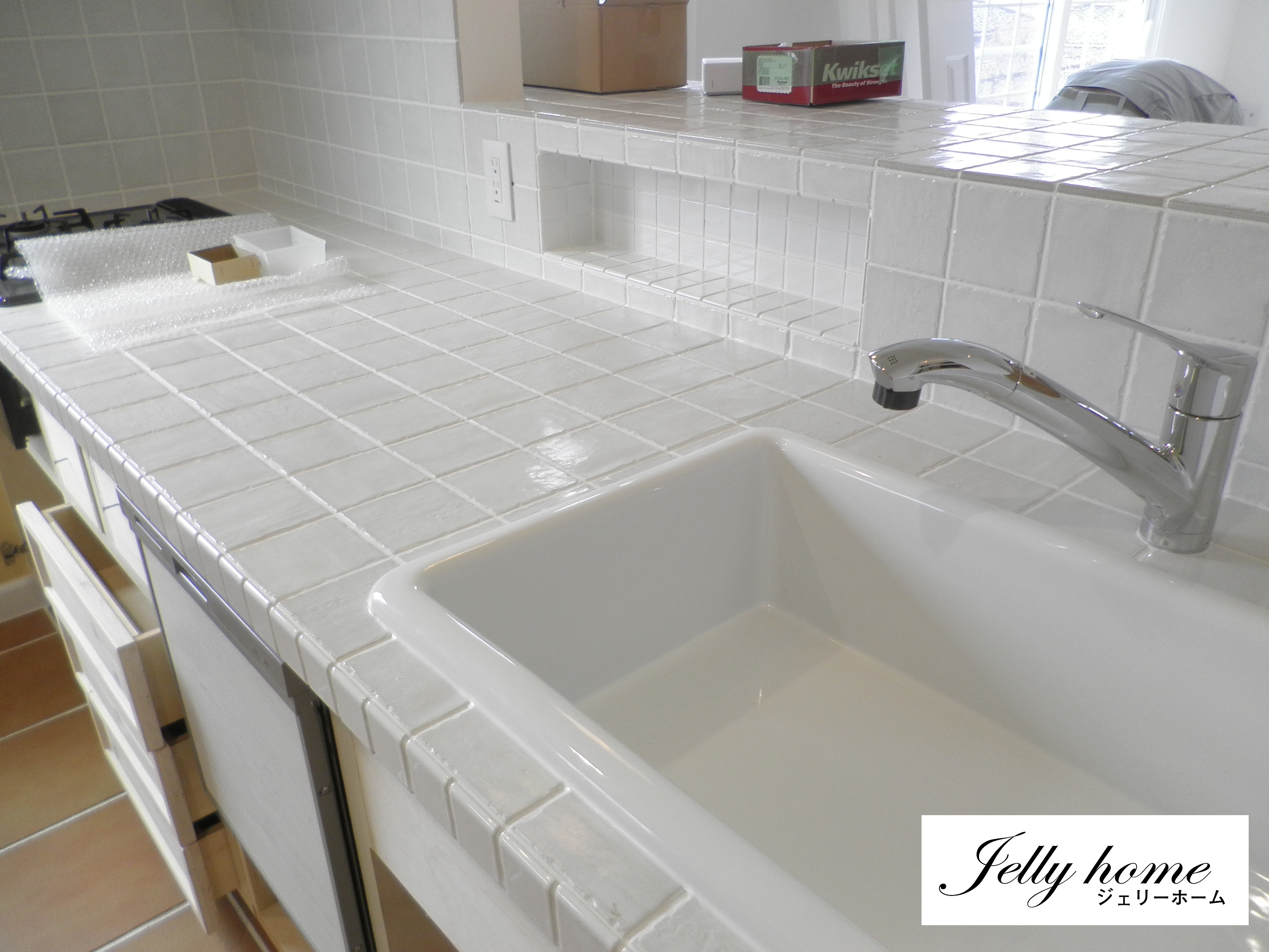 例えば、キッチン前カウンターはタイル貼りにして一体感を出して、