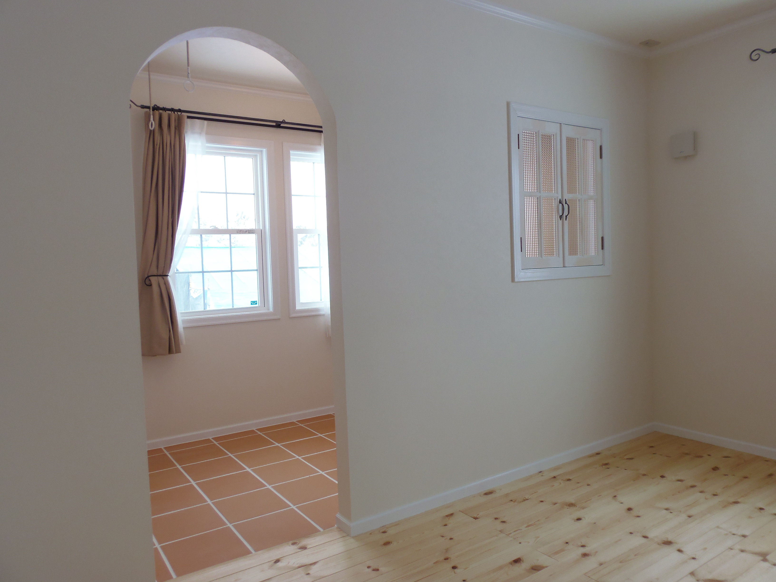テラコッタの床と、M様がどうしても欲しかったチェッカーガラス入りの飾り窓が