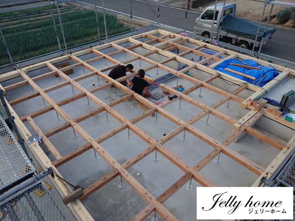 べた基礎上に鋼製束で固定された土台間には断熱材が充填される。
